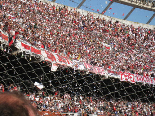 少し早く着いたので、レストランでステーキとビール+ワインを腹に収め、スタジアムの方へ歩いて行った。途中続々とRiver Plateのユニフォームやチームカラーの赤を着た集団が歩いている。もう赤一色でほかのチームのシャツを着ていたら大変なことになりそうだ。実際、試合前後には町のあちこちでチーム間の乱闘騒ぎが起きるらしい。特にBoca JuniorsとRiver Plateの試合は"clasico"と呼ばれる日本でいう巨人阪神戦のような伝統試合なので荒れるらしい。