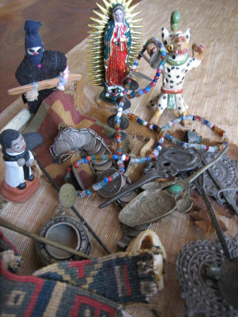 15年ほど前にペルーを旅したときに買い求めたガラクタたち(メキシコのサパティスタ解放軍の人形とグアダルーペのマリア像も混じっている)。金属の髪飾りやスプーン、装飾品は18,19世紀のスペイン統治時代のものらしい。